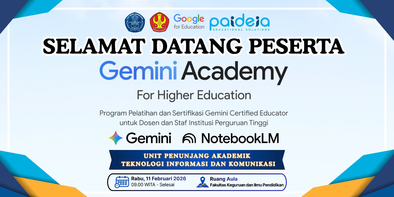 PALU, UPA TIK – Dalam upaya mempercepat transformasi digital dan pemanfaatan Kecerdasan Buatan (Artificial Intelligence) di lingkungan akademik, Unit Penunjang Akademik Teknologi Informasi dan Komunikasi (UPA TIK) Universitas Tadulako sukses menyelenggarakan Program Pelatihan dan Sertifikasi Gemini Certified Educator bagi para Dosen dan Staf institusi.